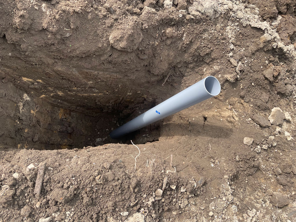 まずはユンボで2メートル、さらにスコップで2メートルほど掘り下げて長さ4メートルの排水用塩ビ管VU100をセット。