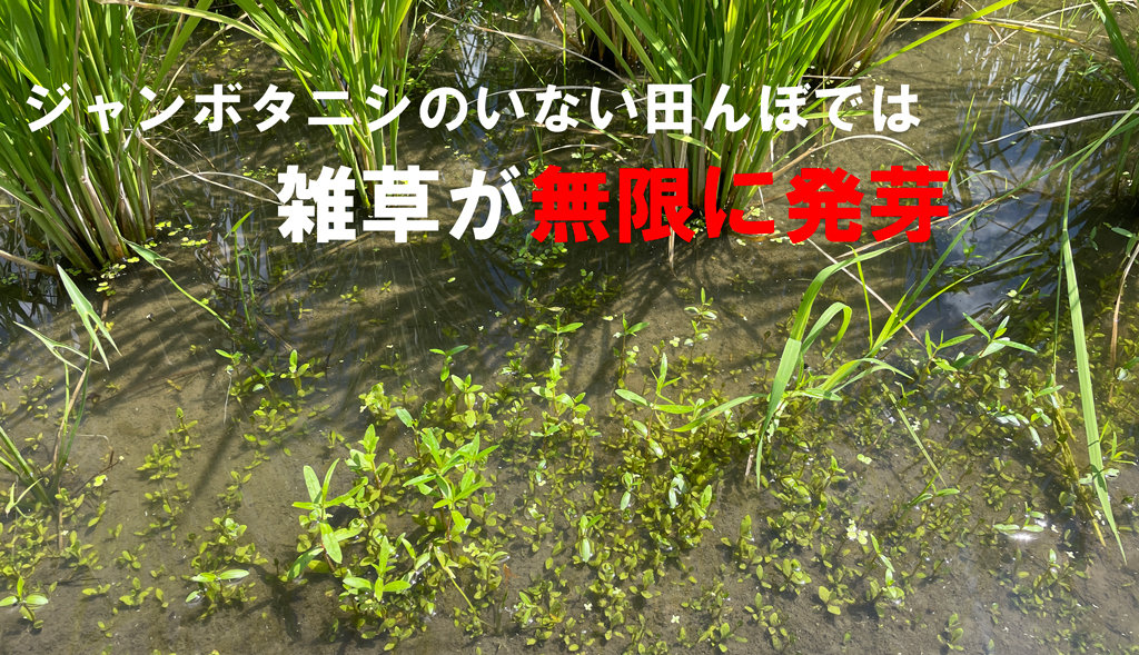 こちらの田んぼではジャンボタニシ君たちとうまく友達になれました。おかげでほぼ雑草ゼロ、稲の食害も皆無。タニシ君たちに感謝です。